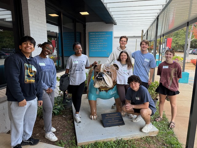 group of students posing with bulldog statue
